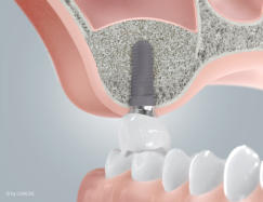 Für eine Implantation muss ausreichend Knochengewebe vorhanden sein. Für den Oberkiefer ergibt sich eine besondere Situation durch die nahe Lage der Kieferhöhle.Nach Zahnverlust verliert nicht nur der Kieferkamm an Knochenhöhe, sondern die Kieferhöhle dehnt sich auf Kosten des Kieferkamms aus (Pfeile). Das Knochenangebot zur Verankerung eines Implantates wird zu gering.